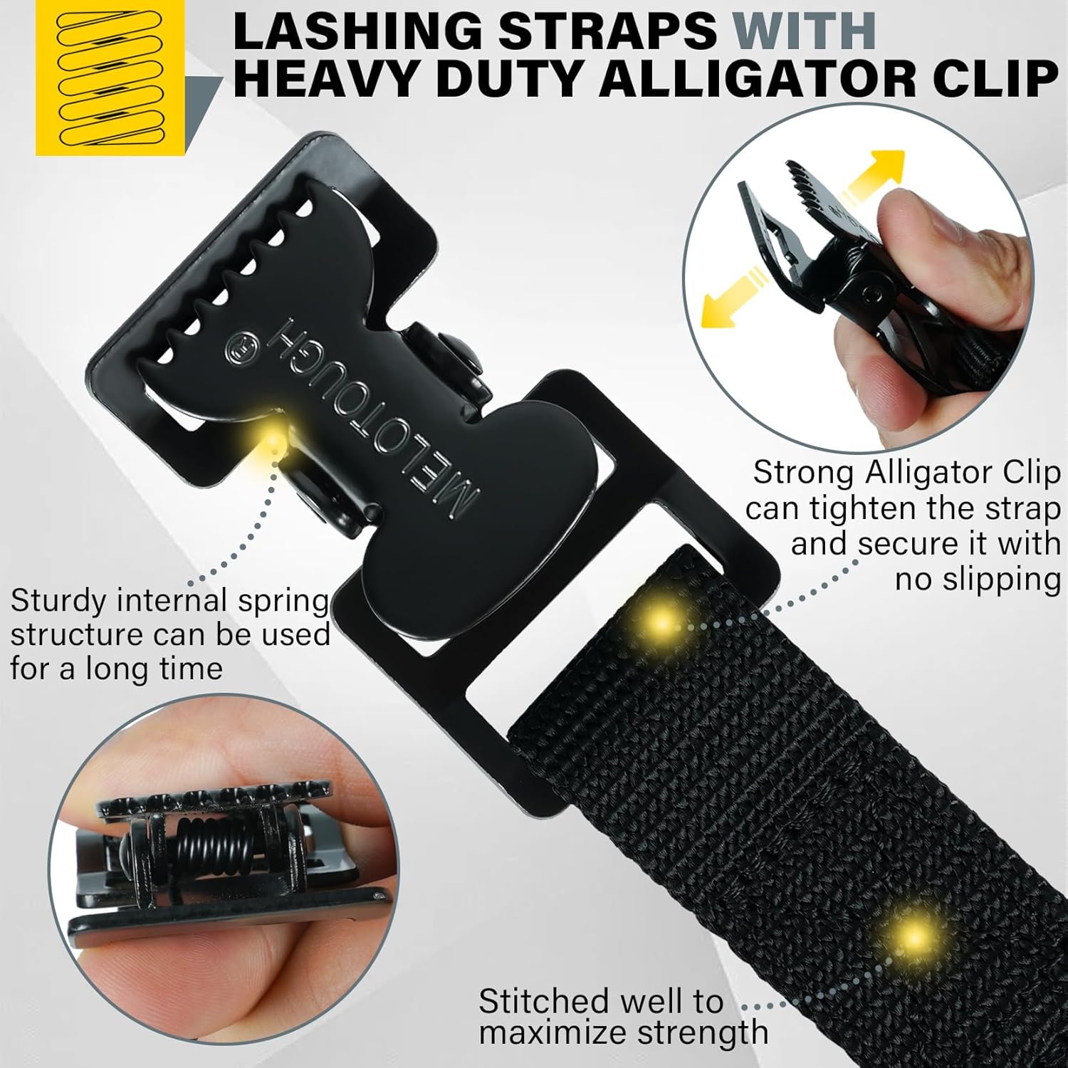 - FEATURES: Black Alligator clip with compacted teeth and good bite holds strap more sturdy than you image.the lashing strap don't slip and hold your item tight and much better than cam buckle.