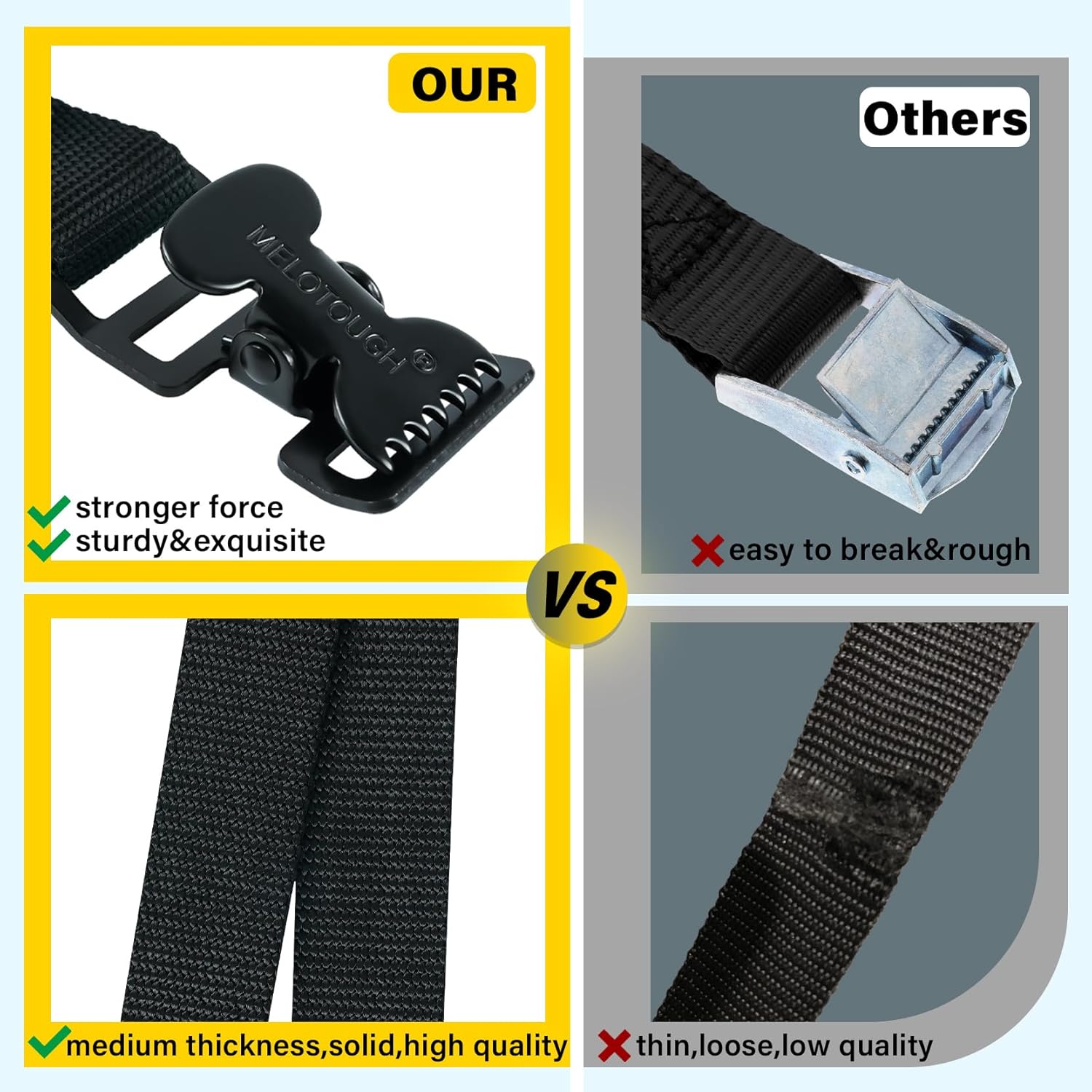 MULTIPURPOSE: MELOTOUGH tie downs straps are widely used to securing down coolers, boxes, ladders, toolboxes,small cargo, luggage, packing, camping gear or household goods etc. A must have lashing straps for every family
