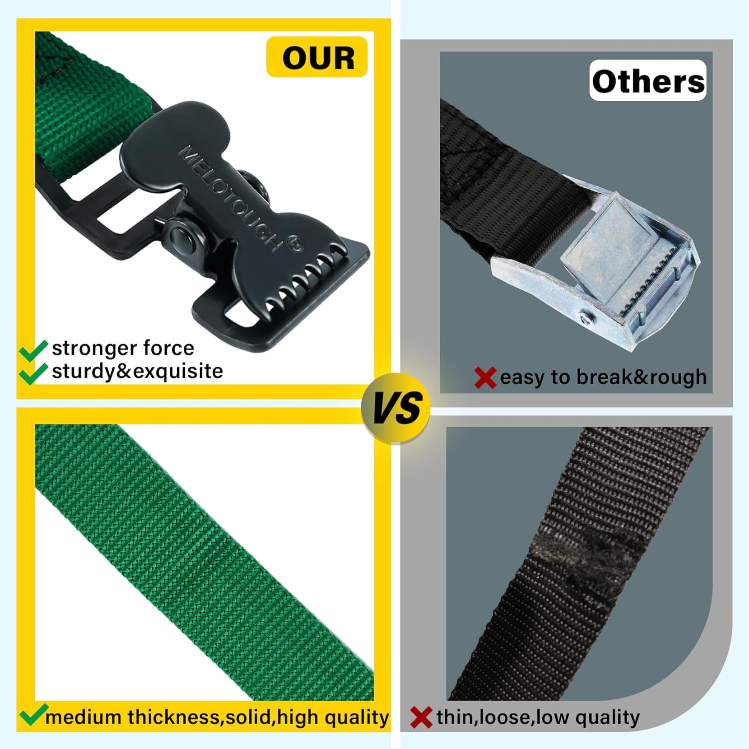 MULTIPURPOSE:MELOTOUGH tie downs straps are widely used to securing down coolers, boxes, ladders, toolboxes,small cargo, luggage, packing, camping gear or household goods etc. A must have lashing straps for every family