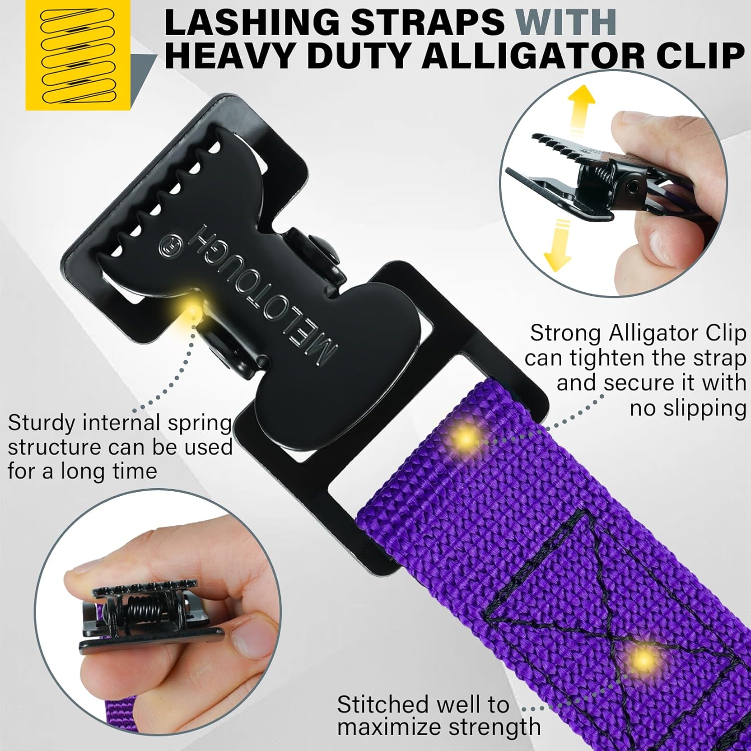 - FEATURES: Black Alligator clip with compacted teeth and good bite holds strap more sturdy than you image.the lashing strap don't slip and hold your item tight and much better than cam buckle.