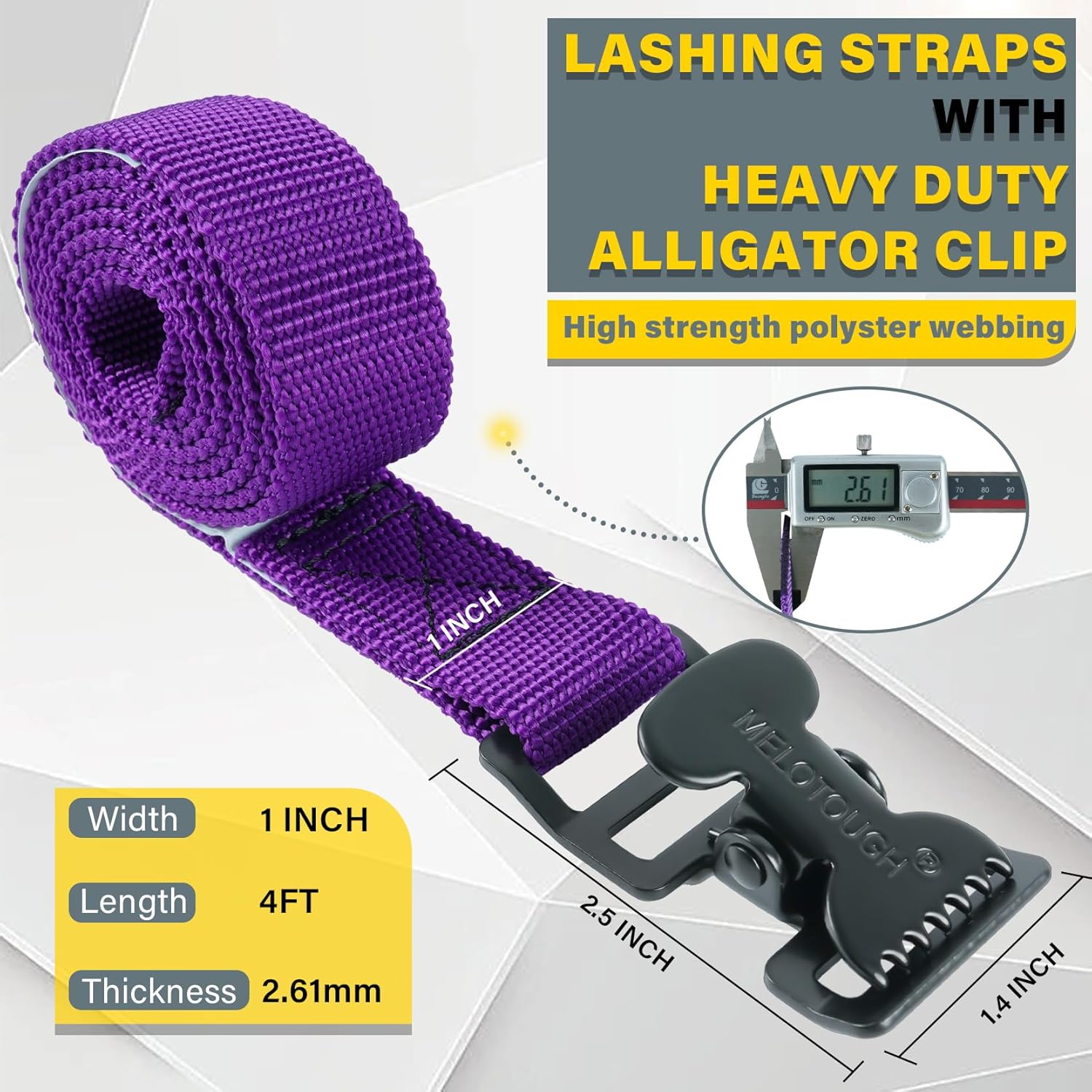 【MTS02-purple】MELOTOUGH 4Pk 1" x 2ft Lashing Strap with Alligator Thumb Buckle Cargo Secure Webbing Up to 450lbs,Ladder Straps,Tie Down Straps,Utility Straps with Clips,Purple