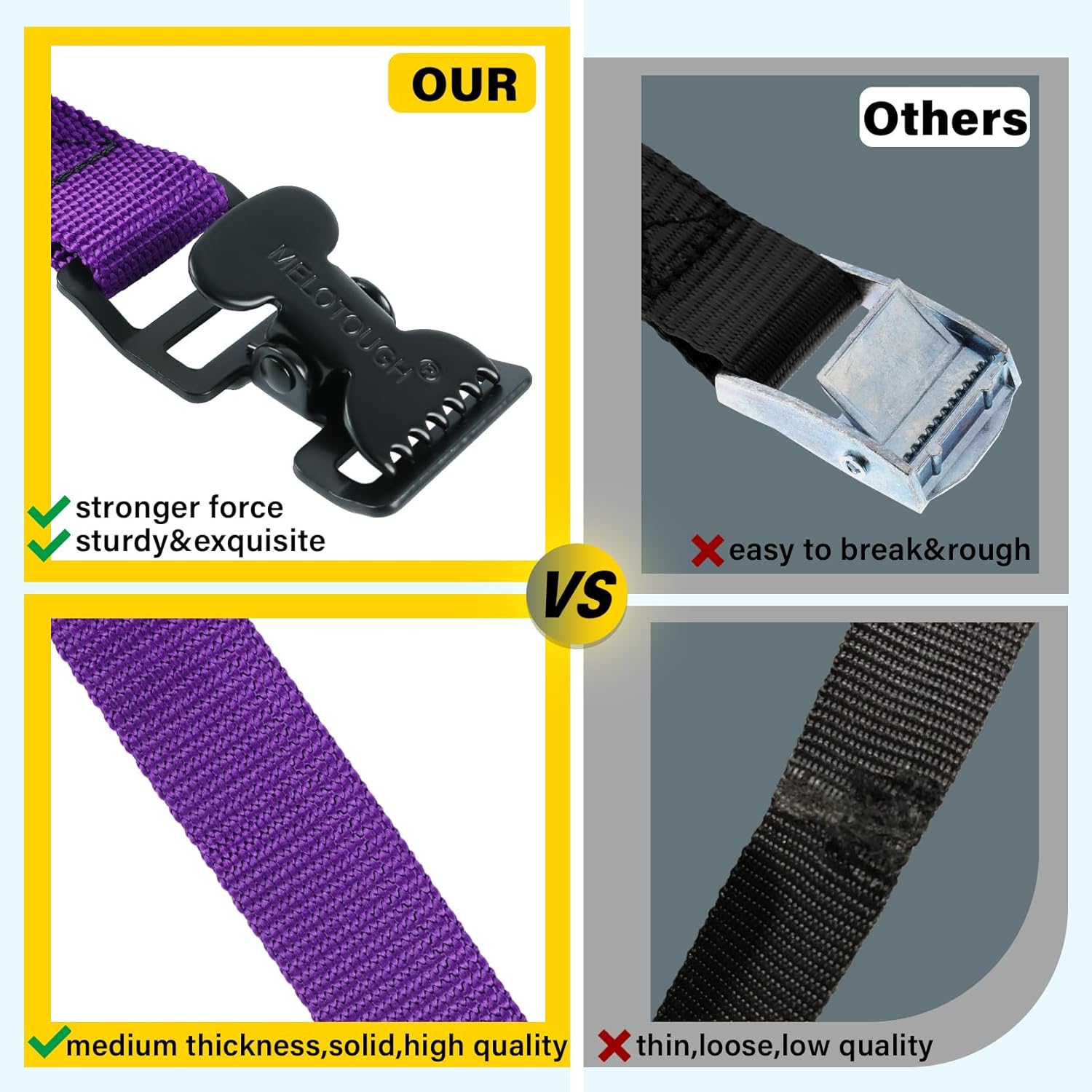 MULTIPURPOSE: MELOTOUGH tie downs straps are widely used to securing down coolers, boxes, ladders, toolboxes,small cargo, luggage, packing, camping gear or household goods etc. A must have lashing straps for every family