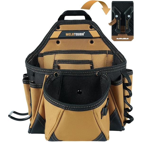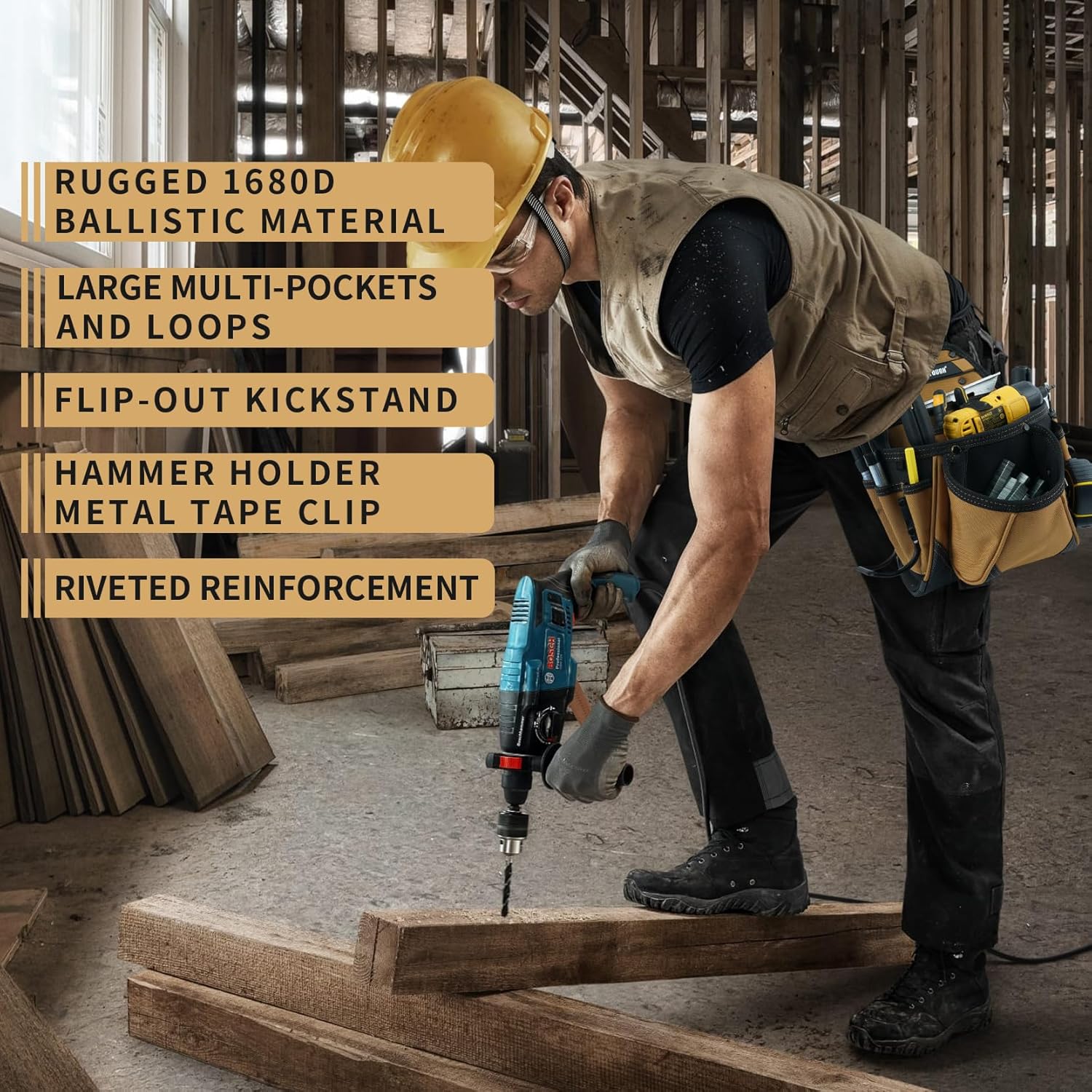 【MQCF02-Khaki】MELOTOUGH Contractor Electrician Tool Pouch - Nail Screw Work Framer Belt With Hammer Loop Clip-on Utility Organizer and Kickstand Back