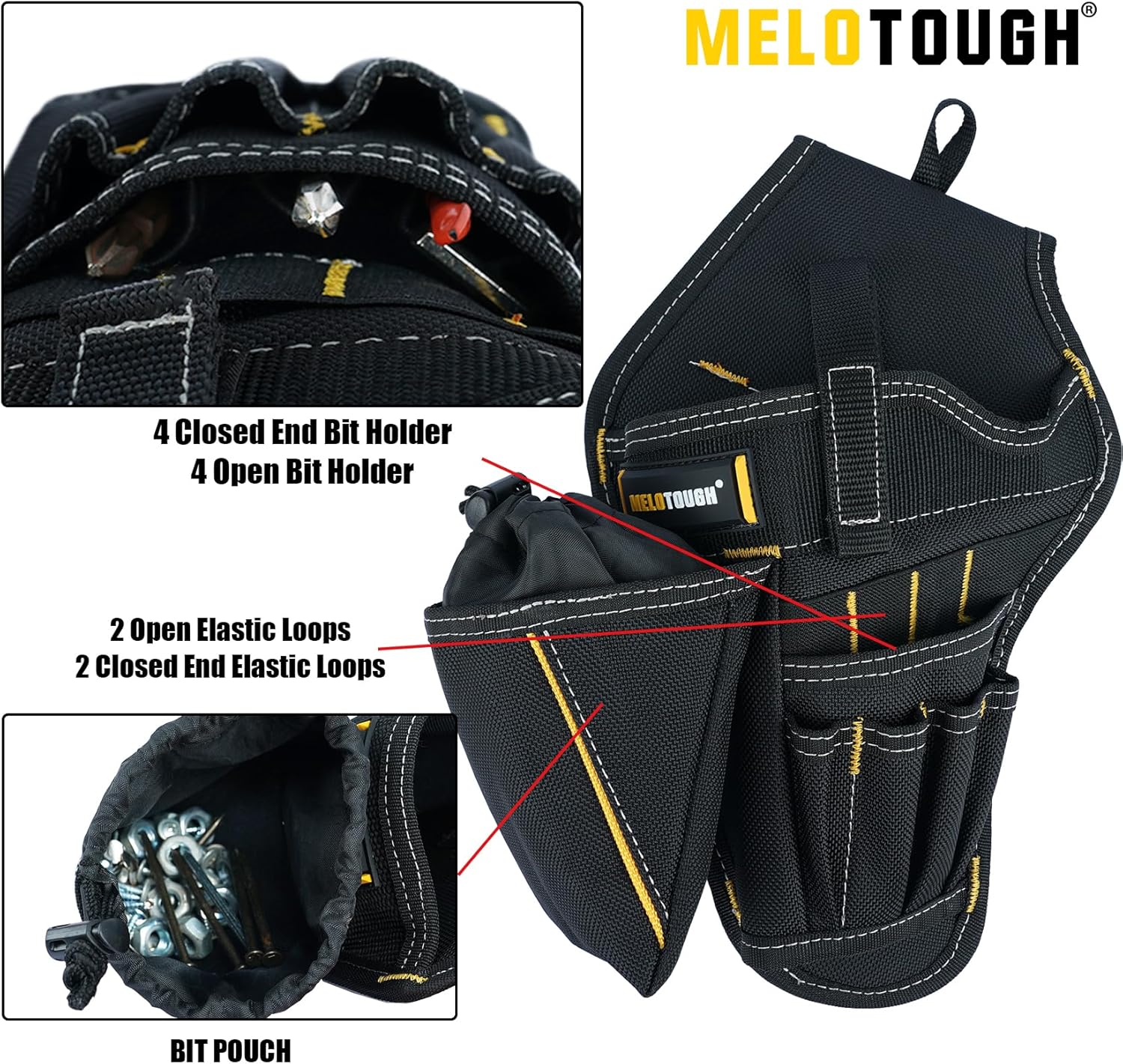 POCKET DESIGN : 4 closed pockets and 4 open pockets can hold small screwdrivers, screws, drill extension rods etc. 2 open elastic loops can hold screwdrivers, long drill bits, 2 closed end elastic loops can hold short drill bits, bit pouch can hold some small parts. -