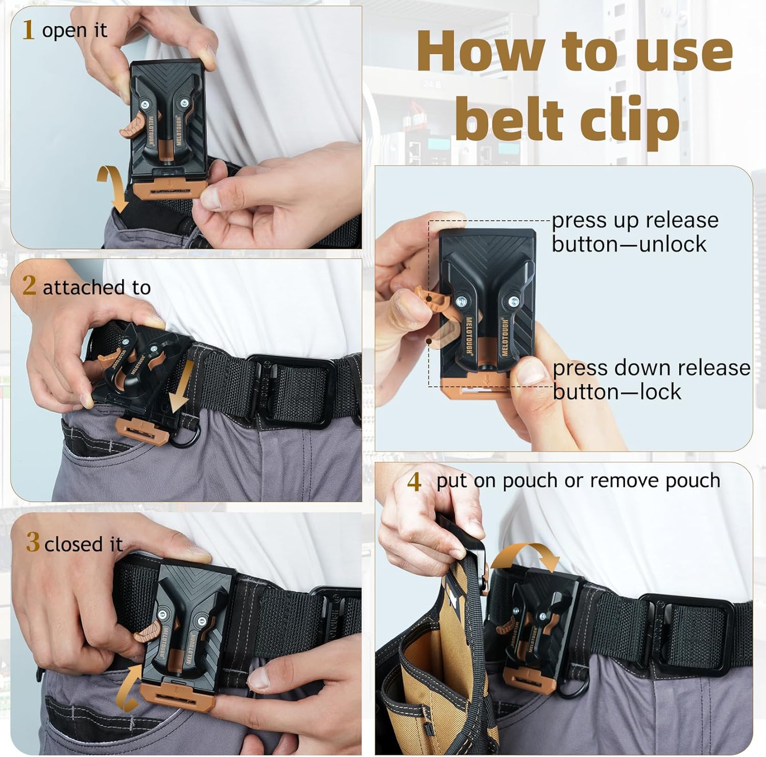 Framer Pouch-Including Quick Detach Belt Clip,easy to clip off & on from any 3inch belt,you can snap it off and put it next to you during break instead of having to undo a whole belt. No more taking the entire tool off. It's very convenient and handy. -
