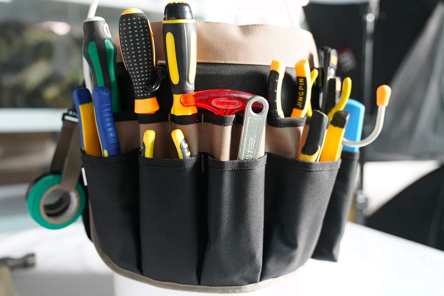Enough Space Bucket tool bag --35 pocket inside and outside ; Electric tape holder , Tape measure holder , key hook , long tools fixed loop -