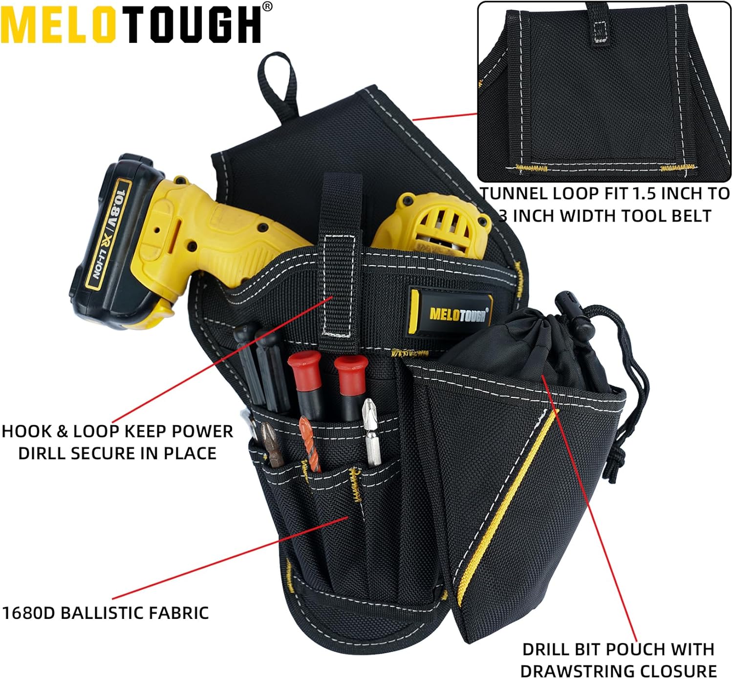 - HEAVY DUTY IMPACT DRILL HOLSTER : Made of 1680D ballistic fabric, durable and suitable for most power drill.
