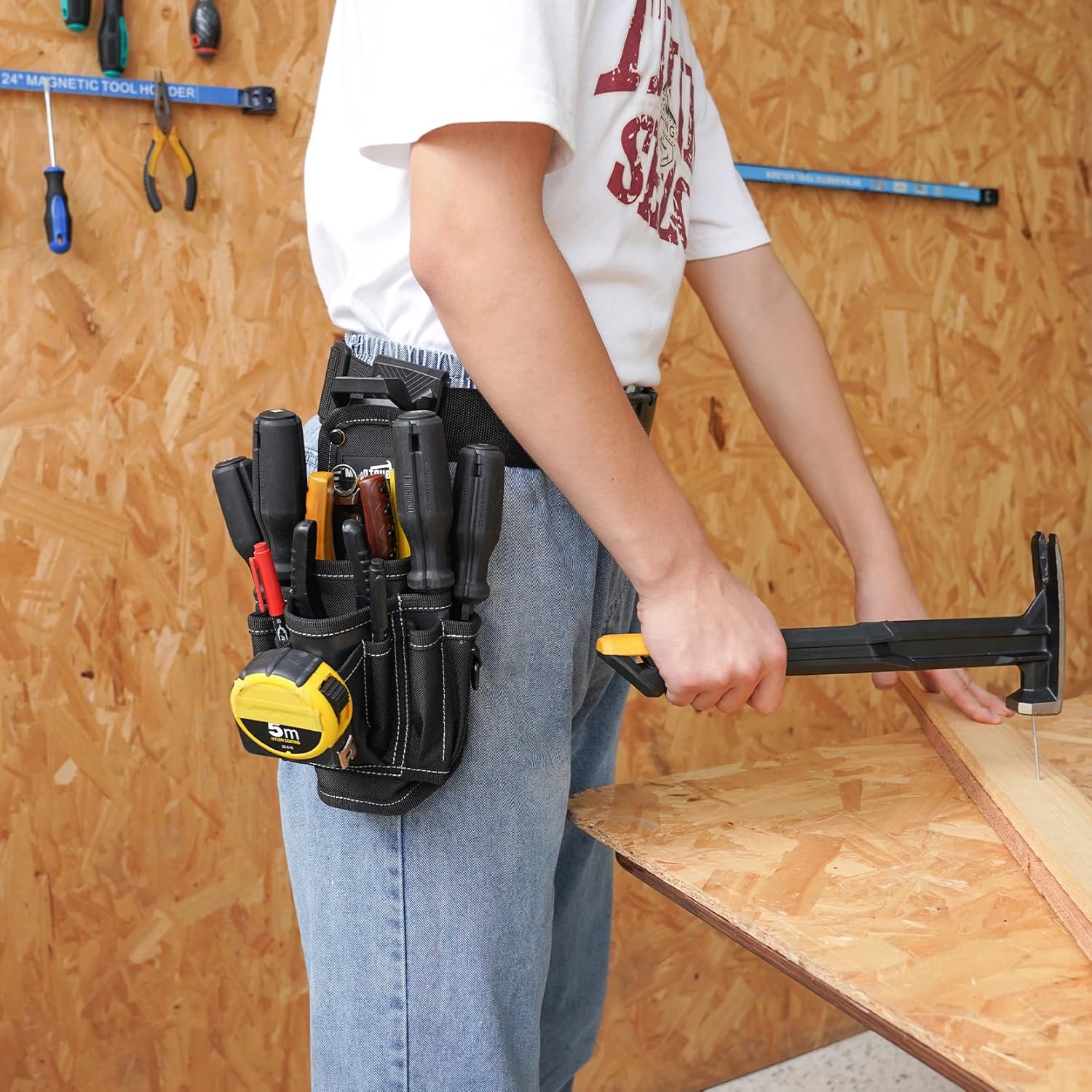 - Tool Belt Pouch--Features 13 pockets in total, including 9 vertical pockets, 4 main pockets,4 pen-sized pockets,a stainless steel tape measure clip perfect for linesmen, needlenose, snips,rivers, pliers, screwdrivers, bits, a pencil, and a tape measure.