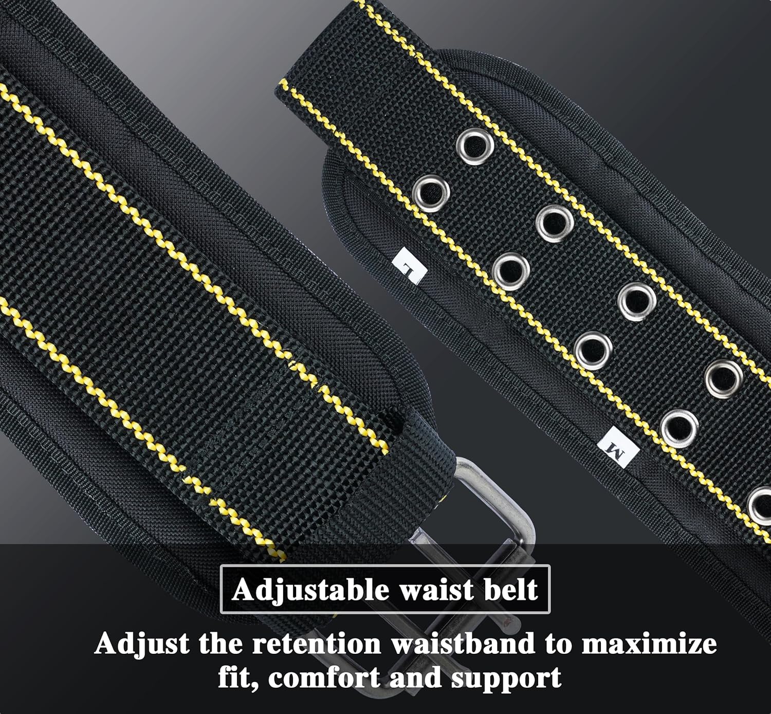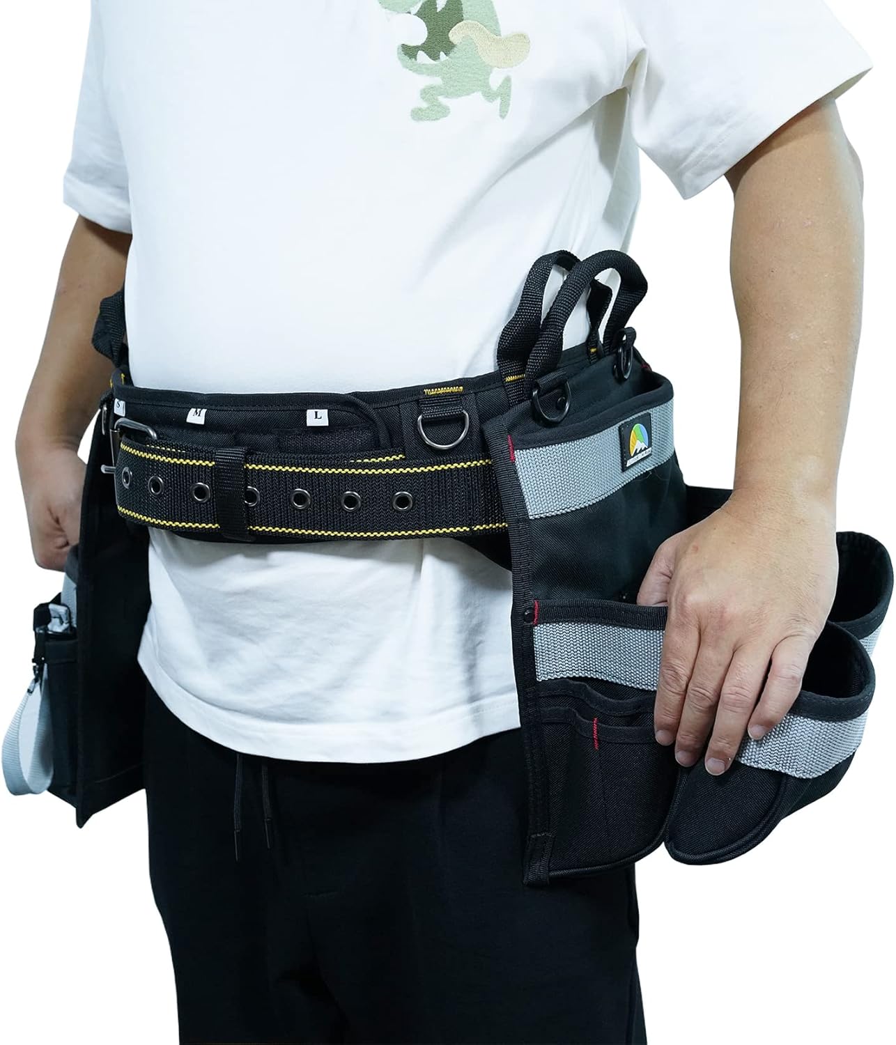 - Tough Material ---600D Polyester Heavy durable fabric make the Tool Belt Survive in any Gear Work . The Padded Belt Inside Dri-Lex Foam Cushion Weight of tool belt itself Taking weight off& Comfortable in