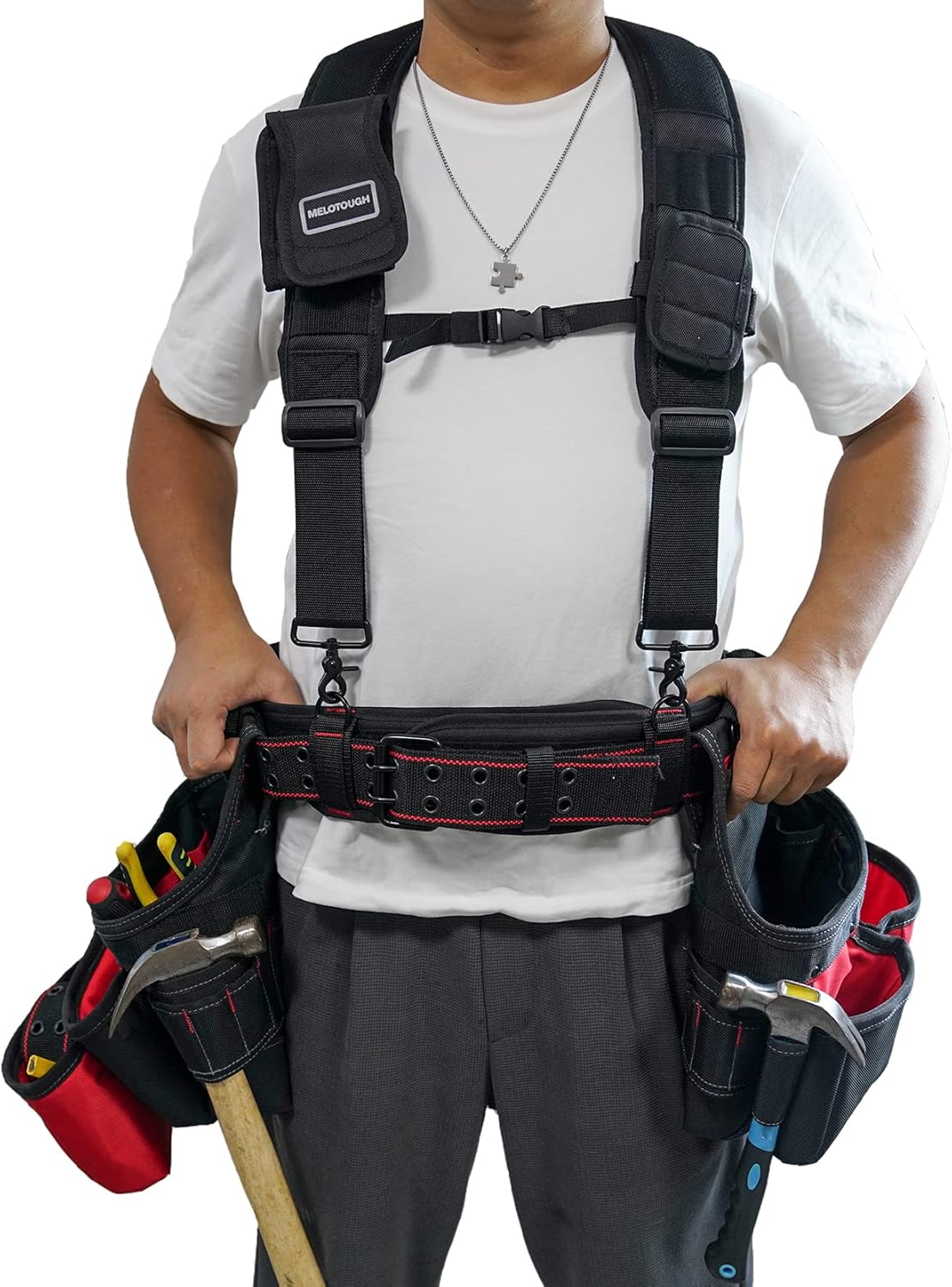 BUILT TOUGH TO LAST LONG --Made from heavy-gauge steel, comfortable padding, high quality fabricsand built to last years in the field. - UNIQUE DESIGN-:Extra 4 suspender D ring Hooks Perfect fit Padded Tool Belt Suspenders Make Your Work In Comfortable Case Great for use by CARPENTER, ELECTRICIAN, FRAMER, PLUMBER, CONTRACTOR, CONSTRUCTION, HANDYMAN, TACTICAL, LAW ENFORCEMENT.