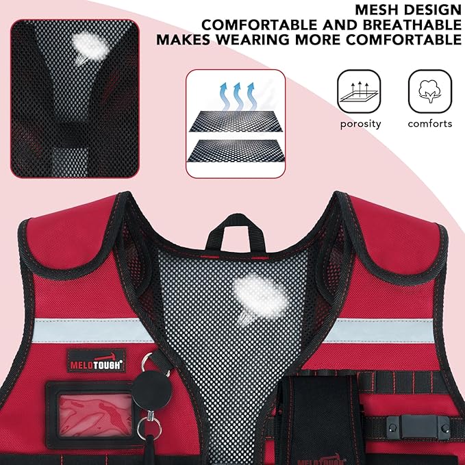 【TV01-Red】MELOTOUGH Tool Vest Safety Work Vest with Adjustable Straps,Removable Phone Holder for Electrician,Construction,Carpenters