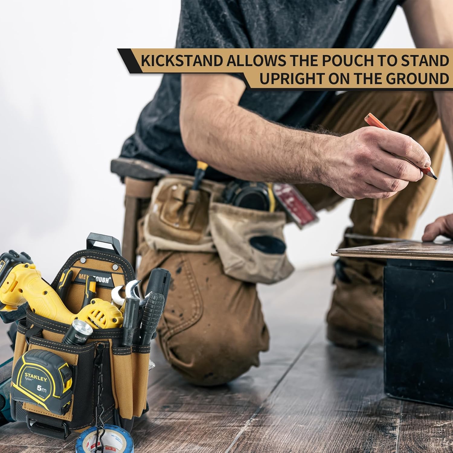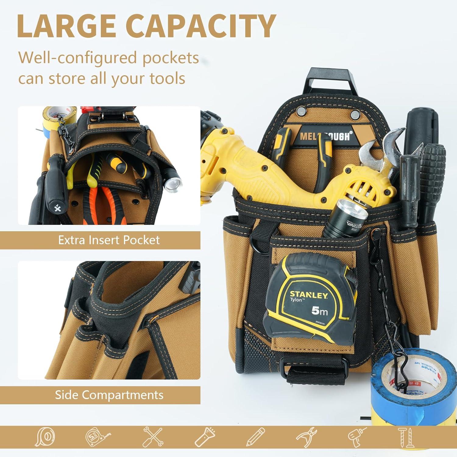 【MQC02-Khaki】MELOTOUGH Small Electrician Tool Pouch With Belt Clip Attachment - 9 Pockets Tradesman Bag With Tape Thong - Holster for Electricians