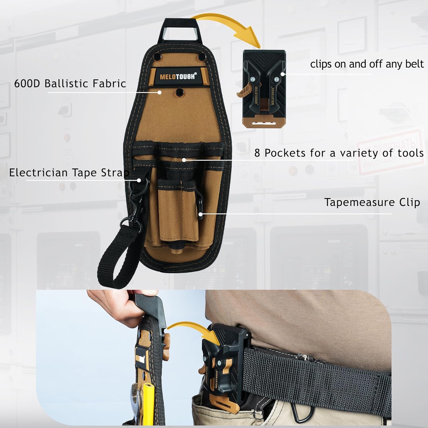 Clip on Tool Pouch--Perfect for the technician electricians, maintenance workers, HVAC, plumbers, carpenters, construction, It distributes the weight evenly and you can take off and put on in a snap,can holds exactly what you need and even with all those tools it doesn’t feel too heavy at the hip. -