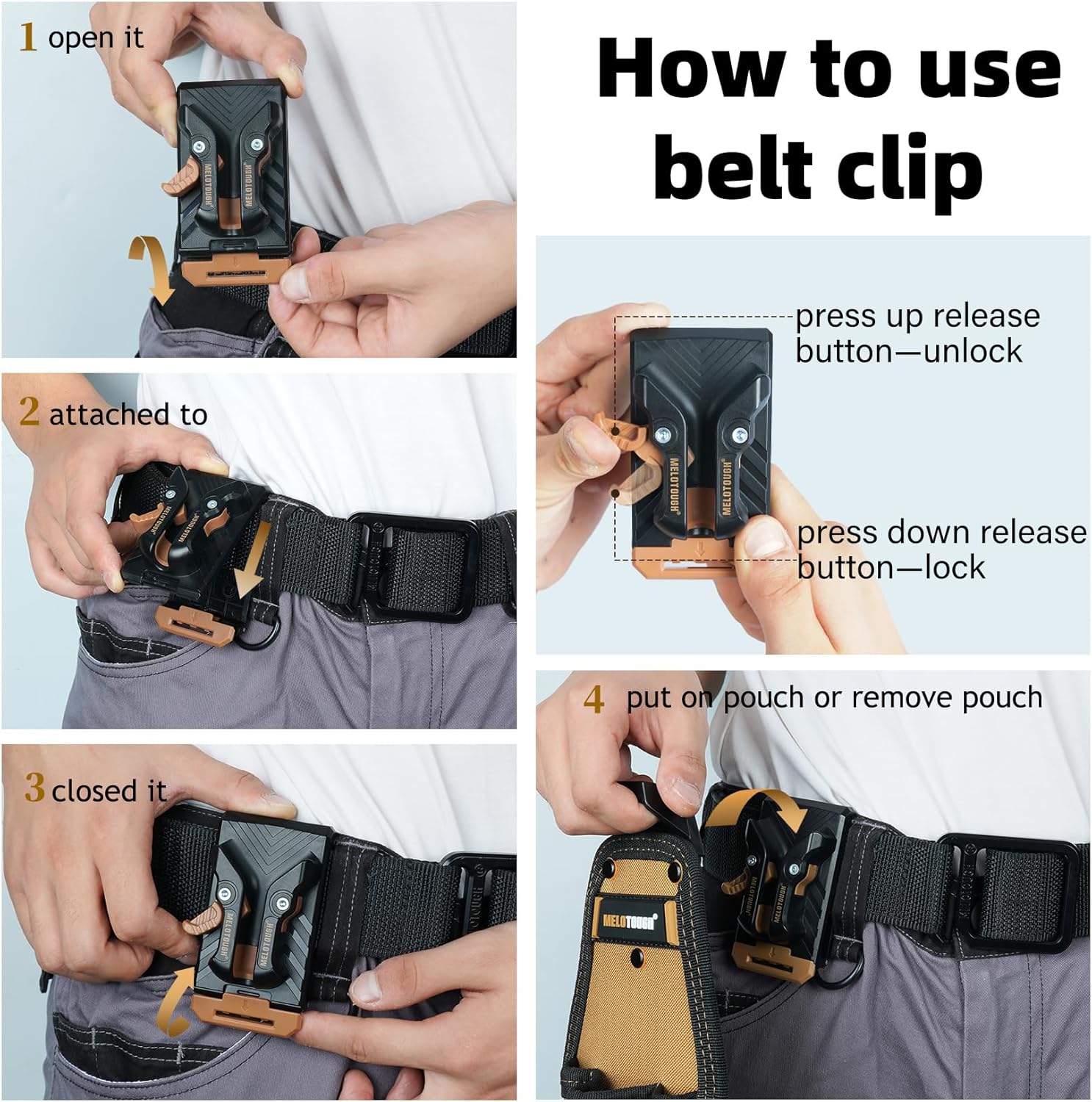 Quick Release Latch Pouch-how easy it is to clip off & on from any 3inch belt,you can snap it off and put it next to you during break instead of having to undo a whole belt. It's very convenient and handy. -