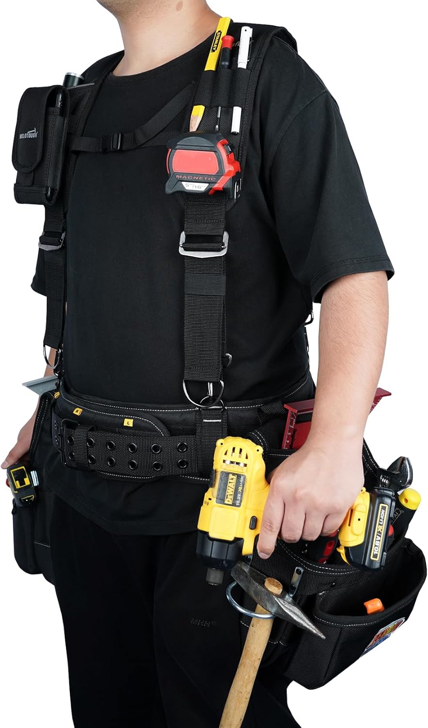 Tough Tool Belt with Suspenders:The Durability is Great. It's Made of 1680D Ballistic Fabric Material,Rugged Webbing , Hardware Steel Double Tongue Roller Buckle and Double Reinforced Stitching As Well As Rivets Also -