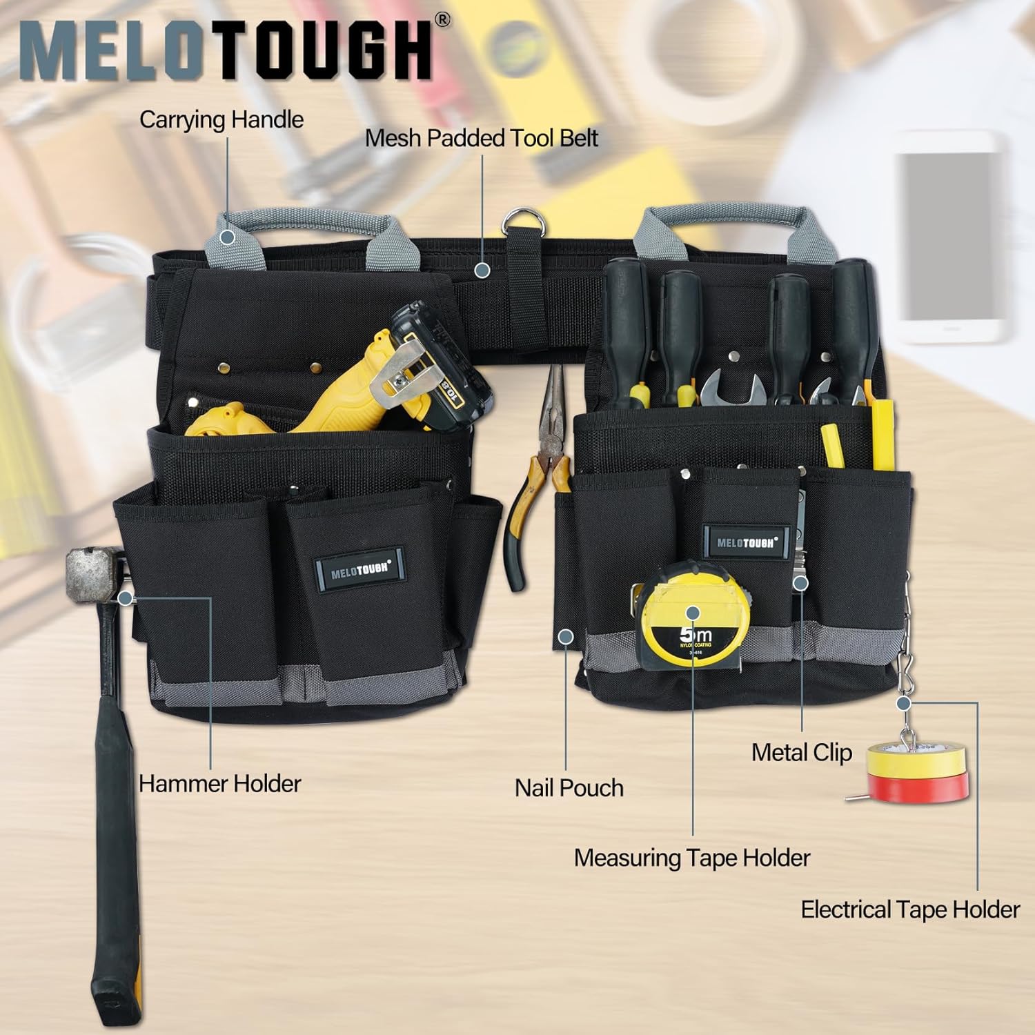 - 5 piece Excellent Carpenter Tool Belt:One Pro Tool Belt;One Suspenders with phone holder ,2 Removable Carry Tool Organizers with Handle,Hammer Holder,This one Can Hold Everything You Will Need for Just About Any Job.
