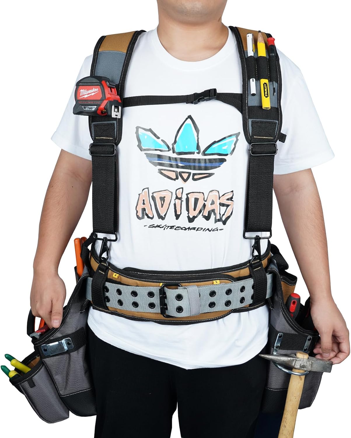 - Tool Belt System :One Pro Tool Belt is Fully Size Adjustable Can Fit Big Guys ;One Suspenders distribute weight comfortably ,2 Removable Carry Tool Organizers with Handle,Afford Plenty of Separation for All Types of Tools,Hammer Holder ,Phone Holder ,This one Can Hold Everything You Will Need for Just About Any Job.