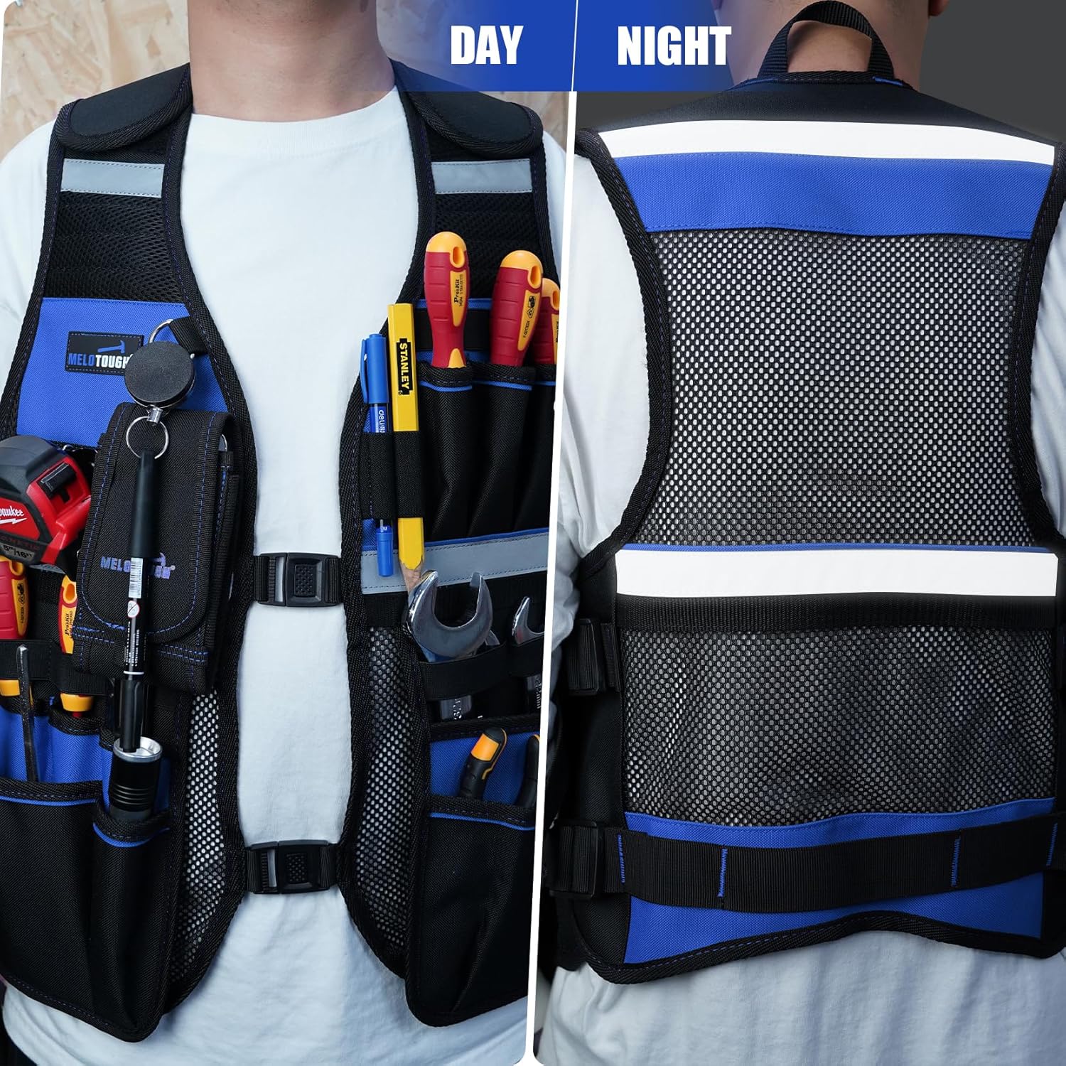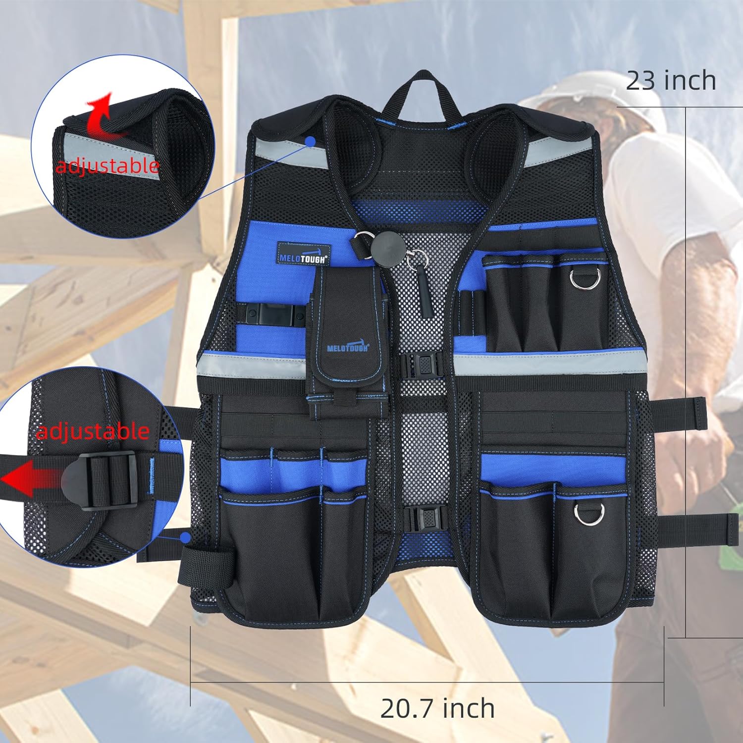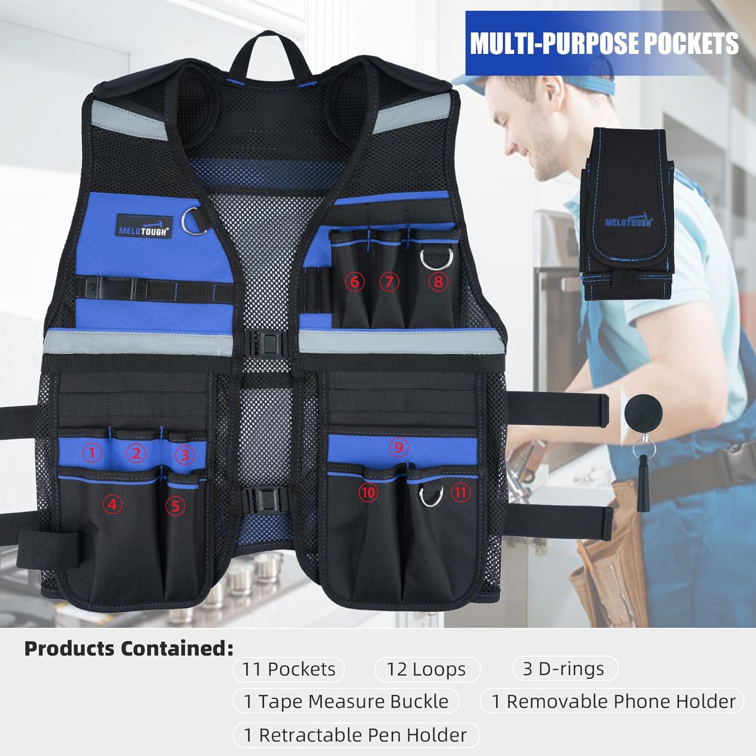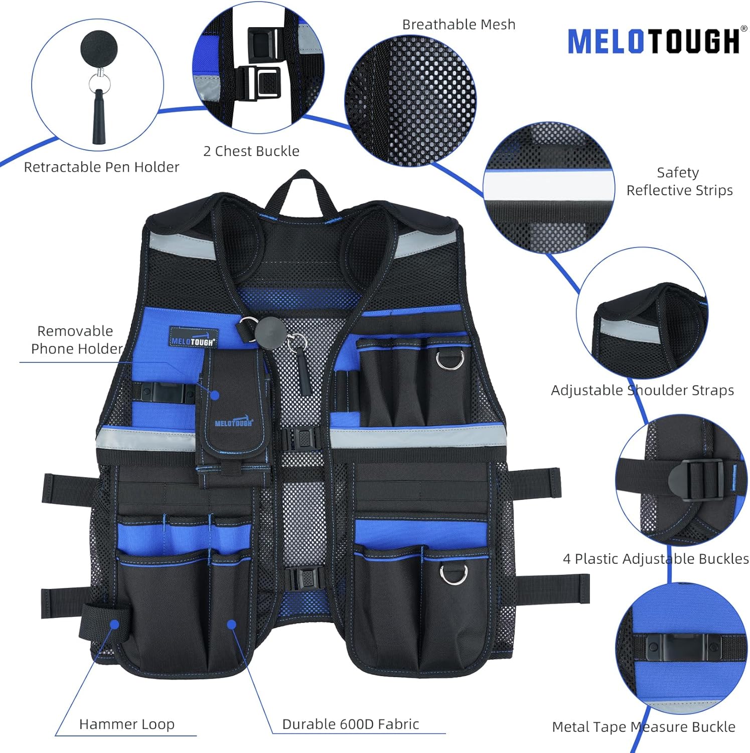 【TV-Blue】MELOTOUGH Tool Vest for Men Reflective Safety Tool Vest with Adjustable Straps, Removable Phone Holder for Electrical, Carpenters, Construction, Handyman (Blue)