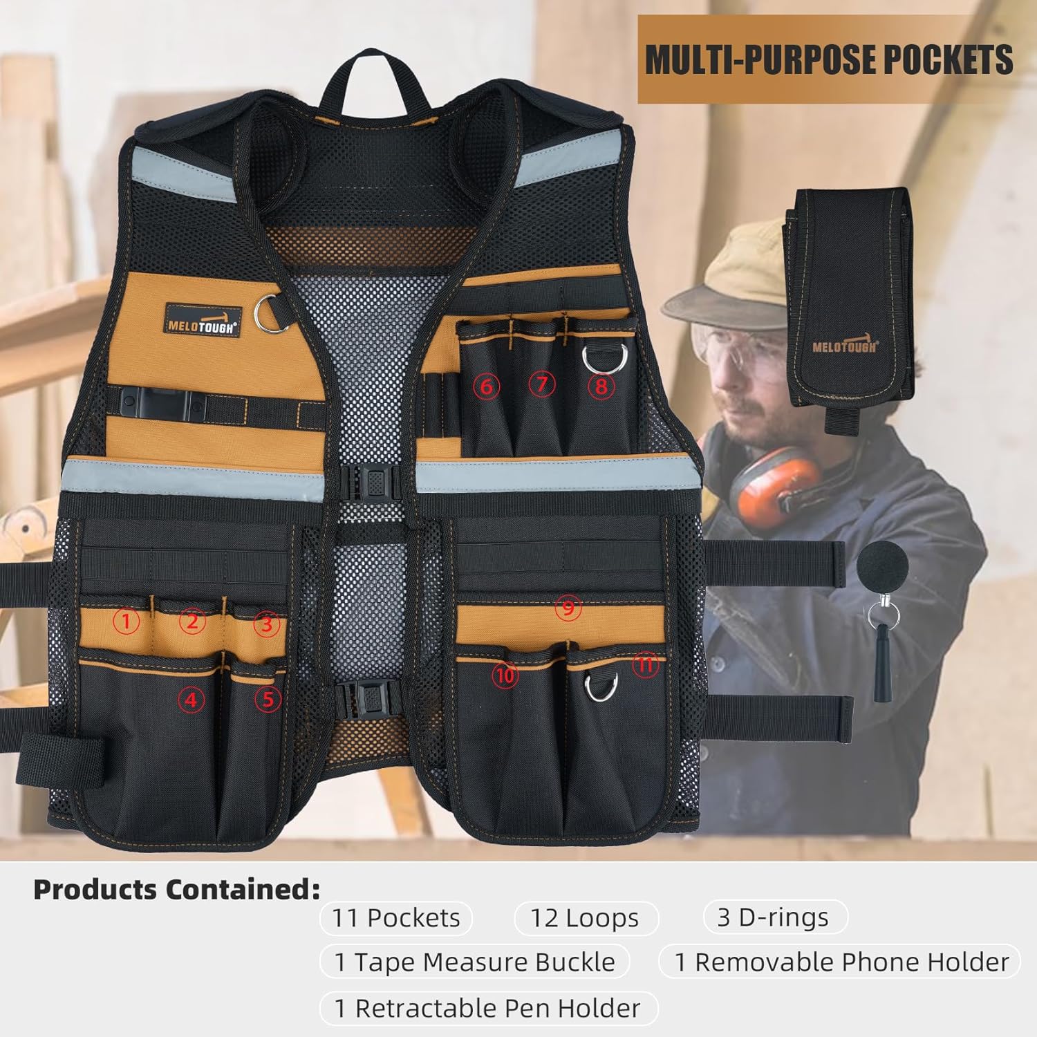 MULTI-POCKET STORAGE: Carpenter tool vest includes 11 pockets, 11 loops,3 D-rings,1 tape measure buckle,1 hammer loop,and comes with 1 removable phone holder and 1 retractable pen holder to meet your various storage needs. -