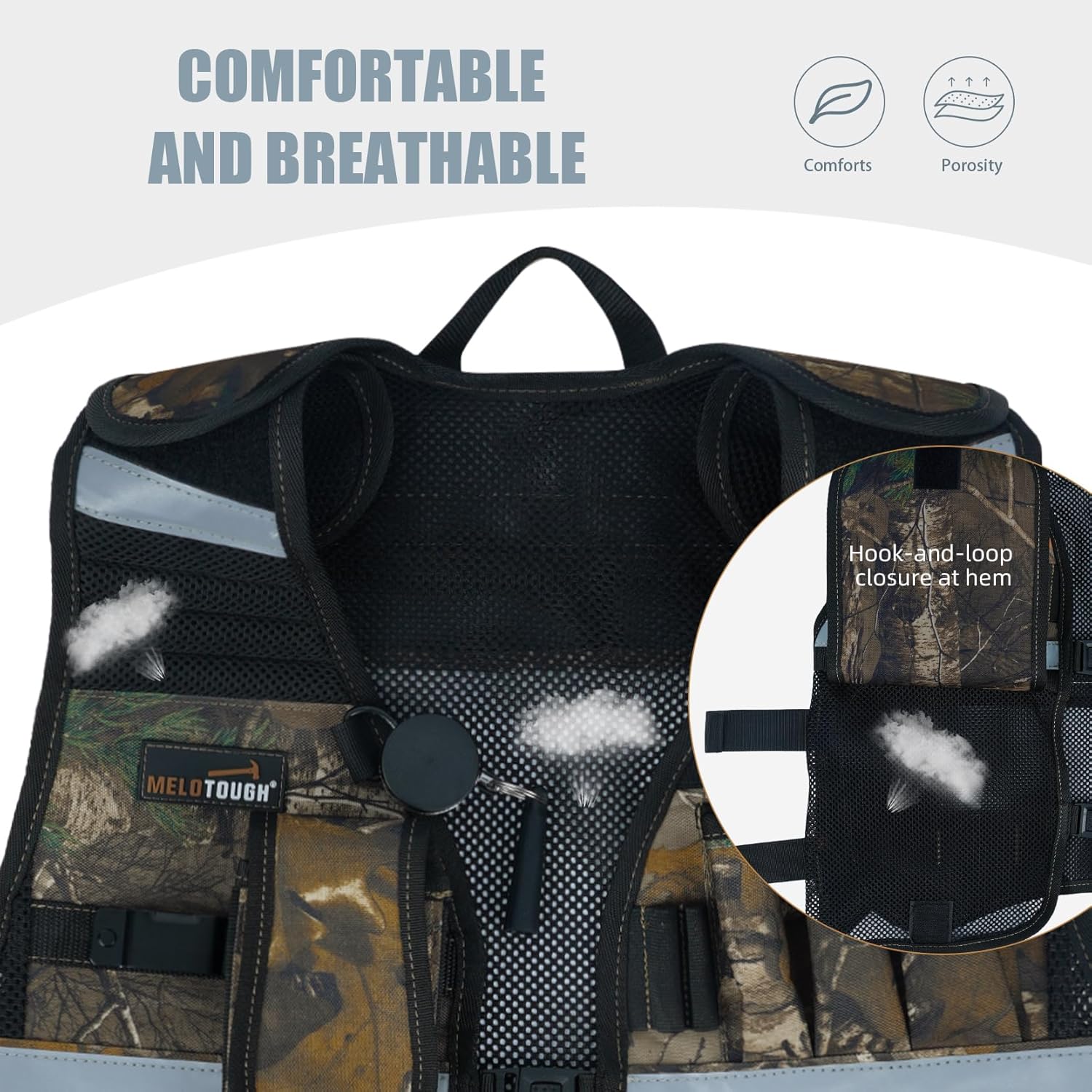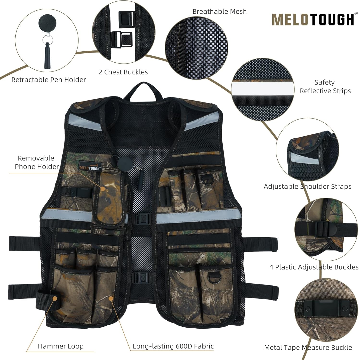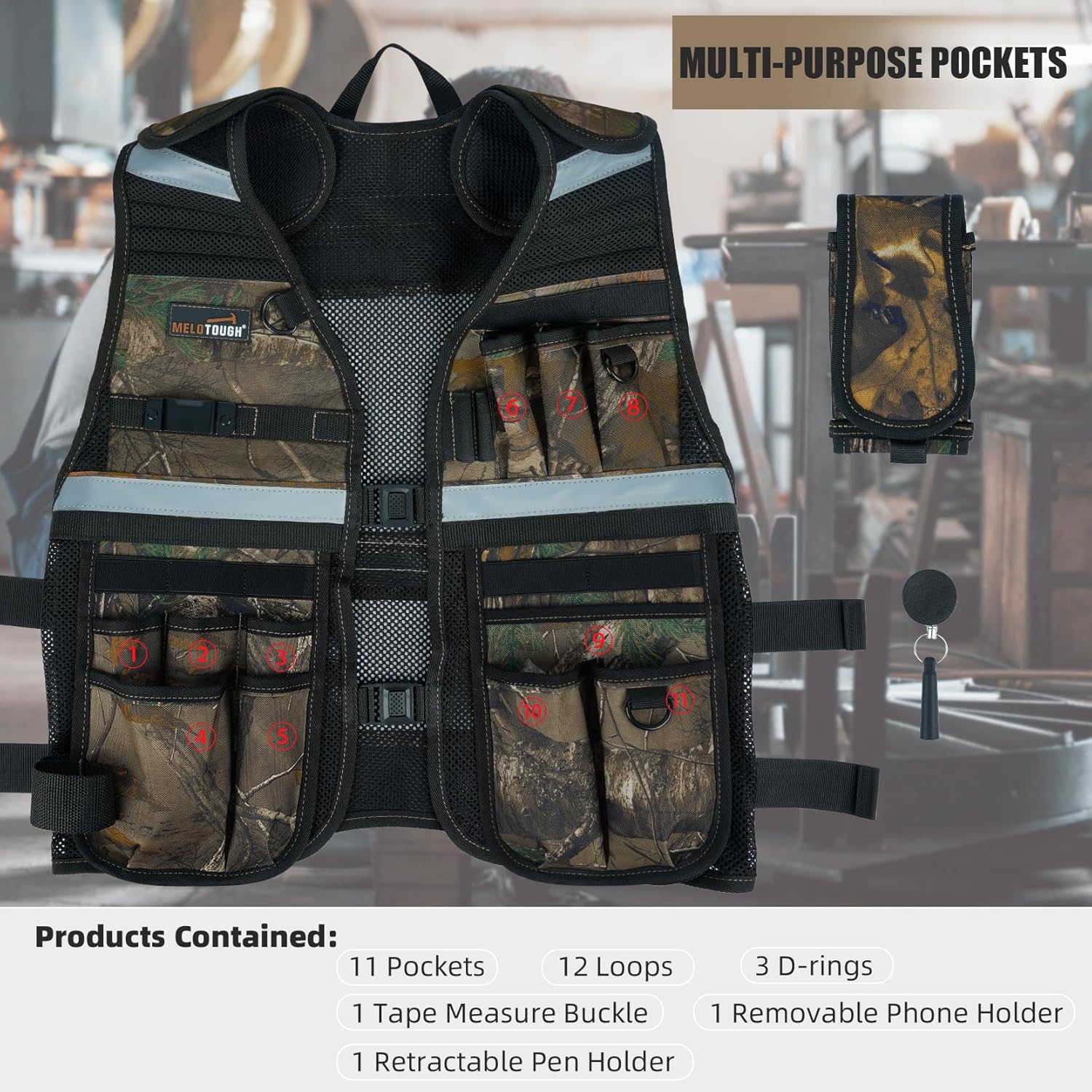 【TV-Camo】MELOTOUGH Tool Vest for Men Reflective Safety Tool Vest with Adjustable Straps,Removable Phone Holder for Electrical,Carpenters,Construction(Camo)