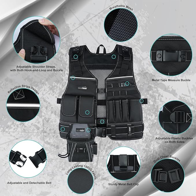 - LONG-LASTING & COMFORTABLE: Both the tool vest and tool pouch are made of 1680D fabric, which is long-lasting. Mesh design on the back of the tool vest improves breathability, while the mesh padding on the shoulders and waistband enhances comfort during wear