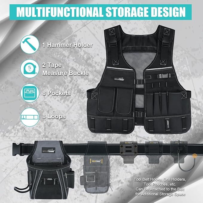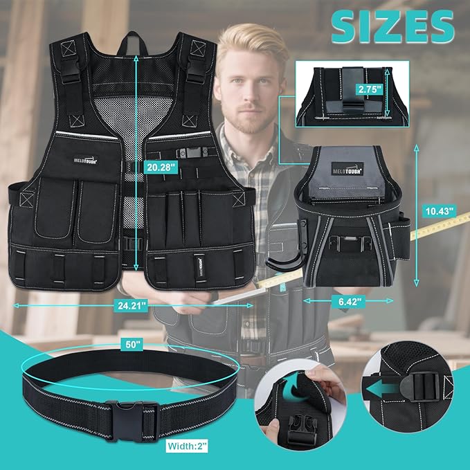 MULTIFUNCTIONAL STORAGE DESIGN: Tool vest includes 6 pockets, 5 loops, and 1 tape measure buckle; Tool pouch (10.43"Hx 6.42"W) includes 3 loops, 1 main storage space, 1 pocket, 1 tape measure buckle, and 1 hammer holder. Additionally, the included detachable belt can be used to hold tool pouches, drill holders, tool belt hooks, etc., providing extra storage space and increasing storage flexibility and convenience, allowing you to adjust what you carry according to your needs -
