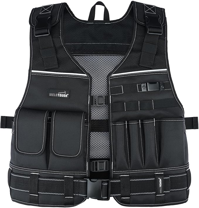 【TV02-Black-P】MELOTOUGH Tool Vest for Men with Pouches and Belt, Adjustable Multi-Pocket Safety Tool Vest for Electrician, Carpenter(Black)