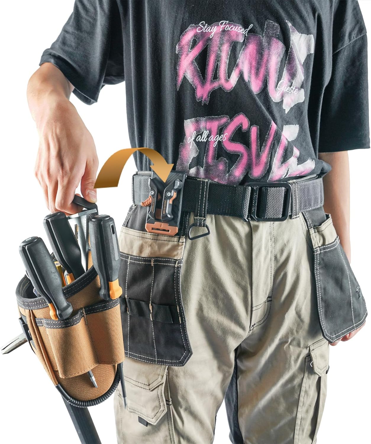 Electrican Tool Pouch :It has 5 pockets ,one hammer holder and one tape measure clip perfect for job designed for store nails ,screws, nuts, bolts, pliers, screwdrivers, cable ties, hammer holder and more. Keep tools or other fasteners close at hand with this easily-accessible tool belt pouch. -