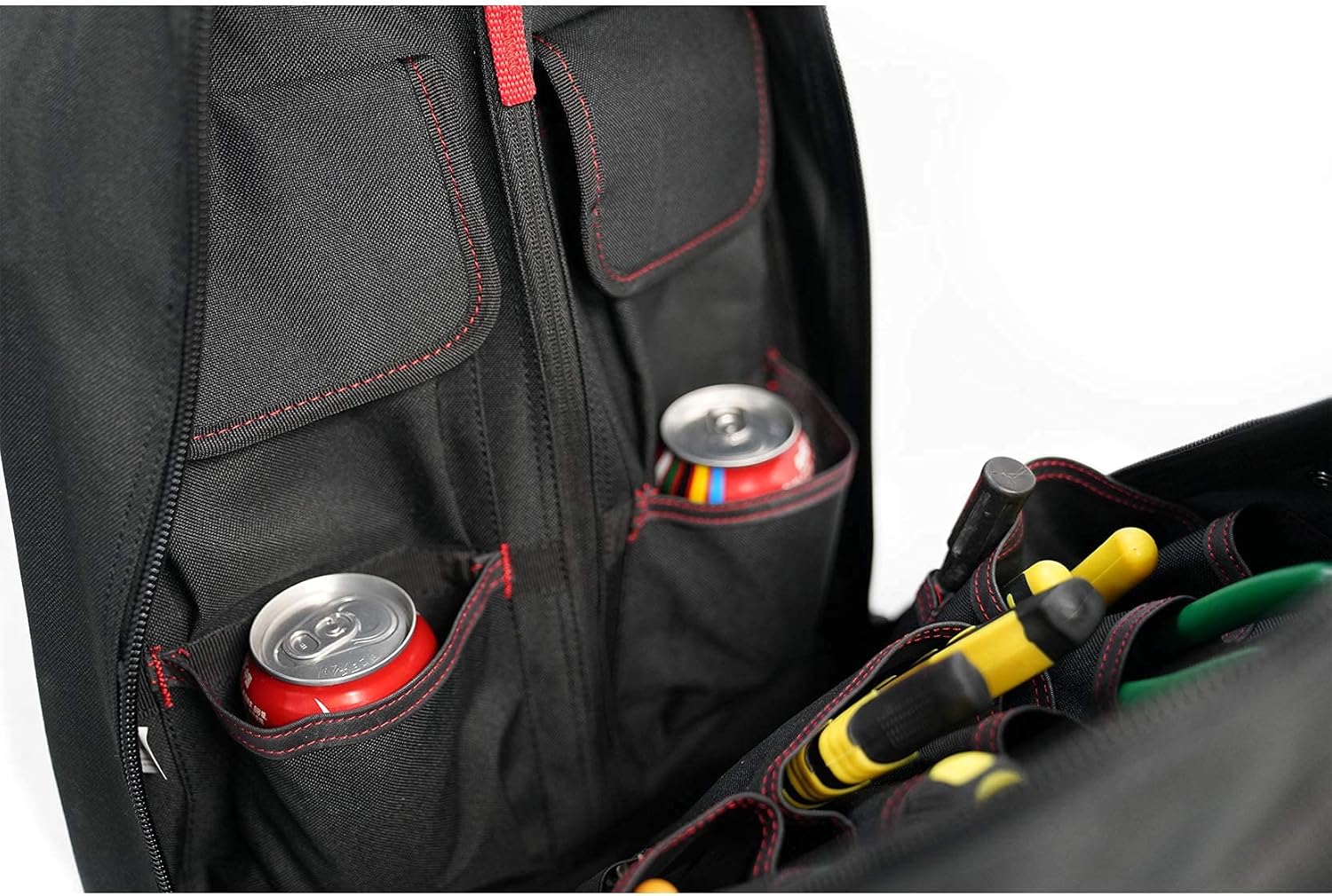 ✅【Perfect Tool Bag】Plenty of pockets and tape measure clip :Outer pocket can hold daily necessary stuff like keys, pens, boooks and side bottle pockets. The main organizer storage room divided 3 main zippered compartments, one for tools and parts, one for a cordless drill and battery, one for laptop
