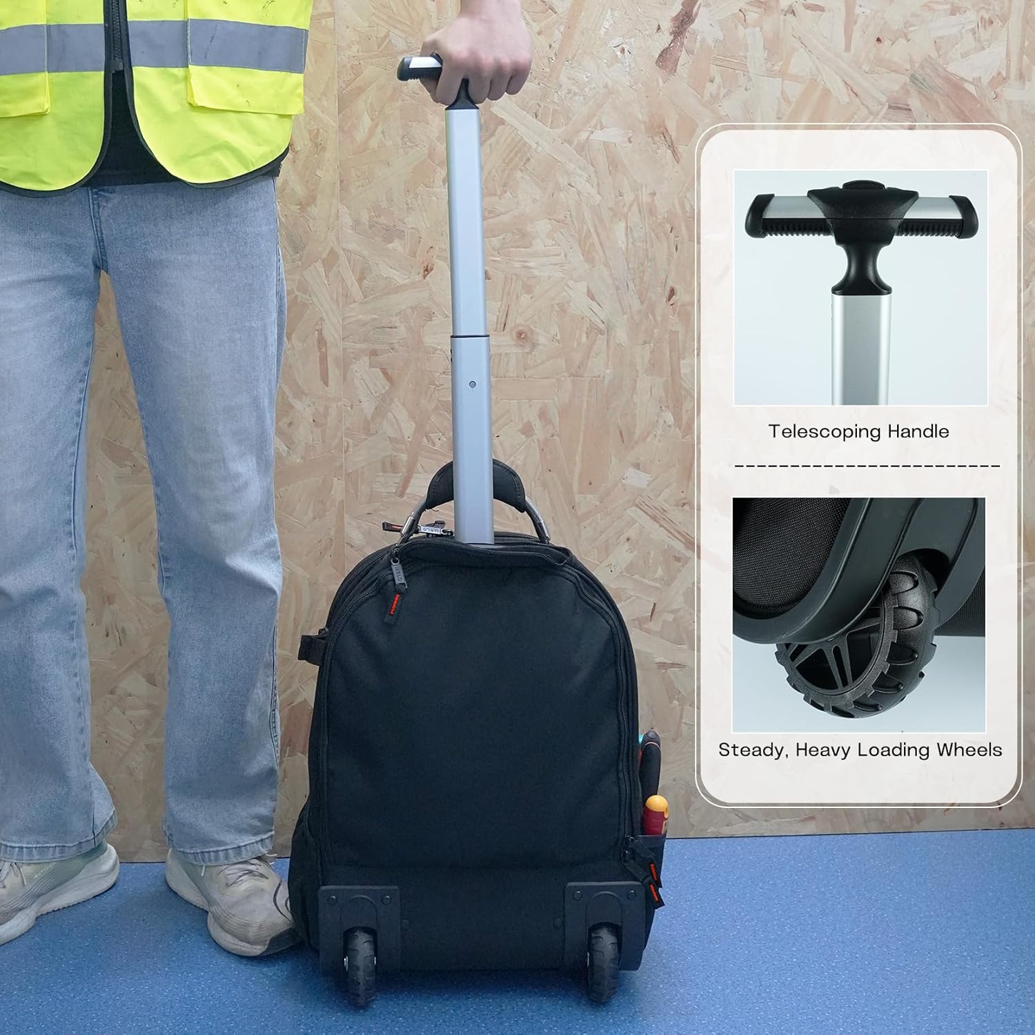 PLENTLY ROOMS FOR STORAGE: This Wheel Rolling Backpack Organize all of your tools in one convenient place. The 26 different pockets are designed to hold your screwdrivers, wrenches, measuring tape, level, drill, electrical fish tape, electronics & more.