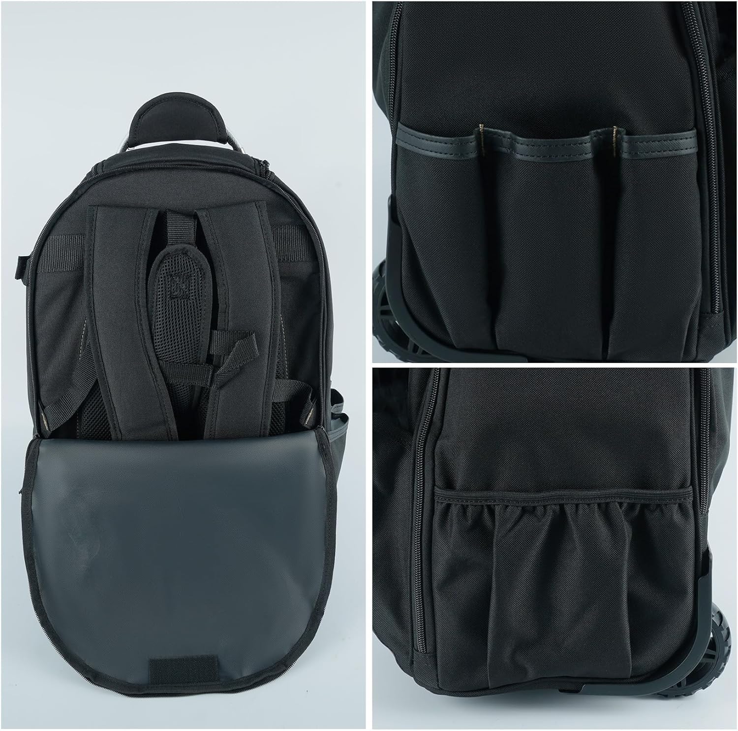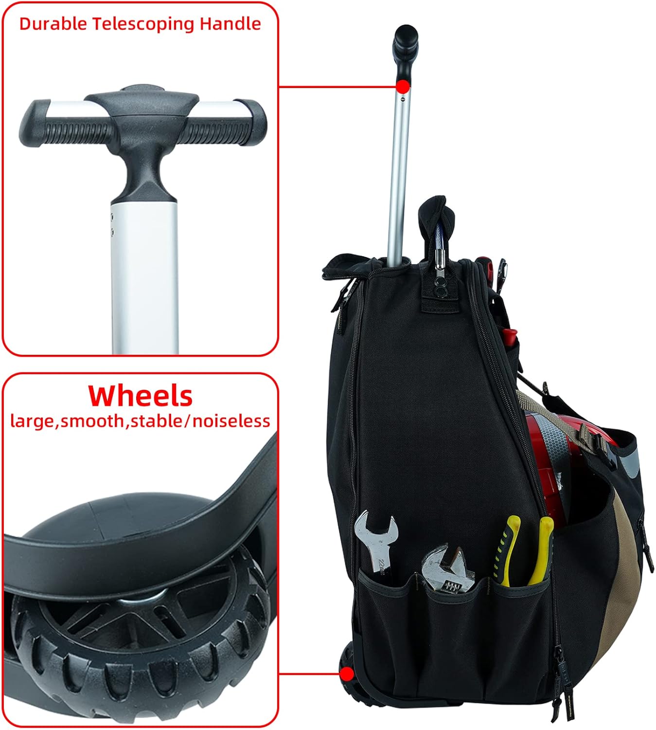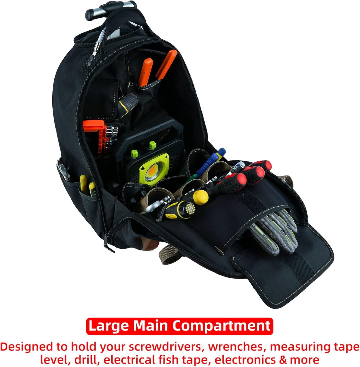 PLENTLY ROOMS FOR STORAGE: This Wheel Rolling Backpack Organize all of your tools in one convenient place. The 26 different pockets are designed to hold your screwdrivers, wrenches, measuring tape, level, drill, electrical fish tape, electronics & more.