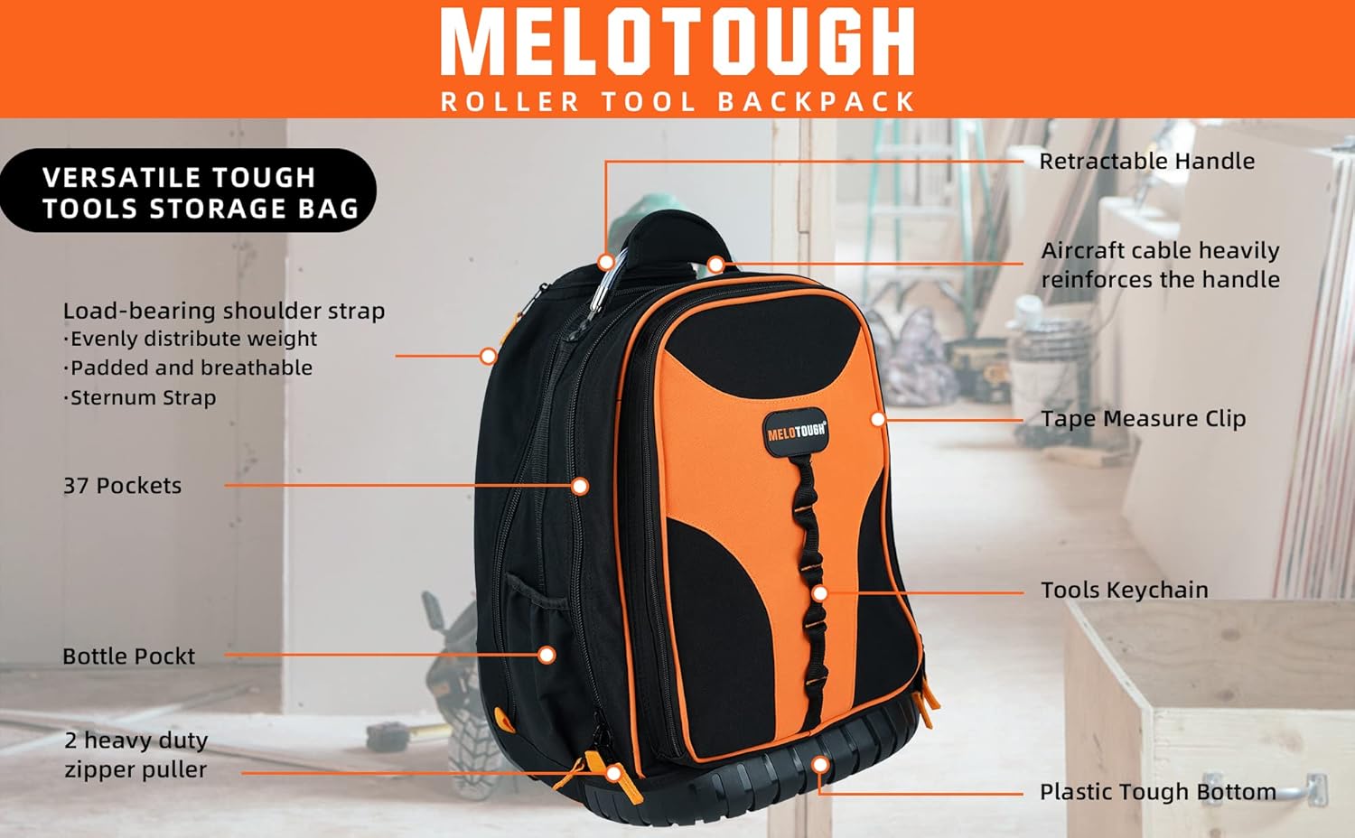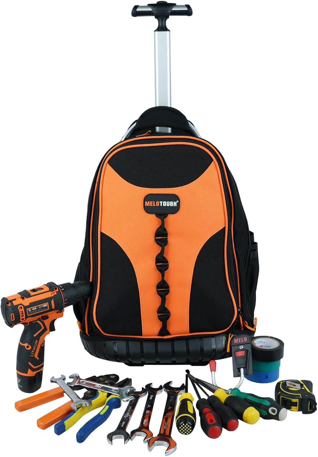 👷【Heavy Duty Wheel Tool Bag】Made by Constructed 600 denier polyester which is durable material thick makes this rolling tool bag a strong and durable way to store your most-used tools; MELOTOUGH QUALITY: ✅When you see a MeloTough product, you know that it is going to last. We make these wheeled tool bag for hard workers, dedicated people who need organizer your belongs in well