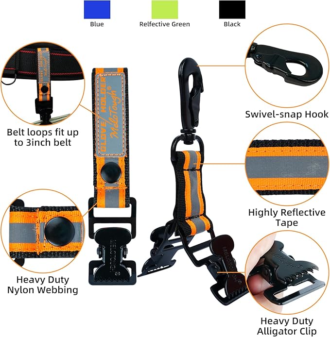 ✅Alligator Clip Glove Holder---Our metal glove clip holder made of heavy-duty 1” wide nylon with reflective tape, a powerful alligator clip that will secure your gloves, and an industrial strength black, swivel-snap hook ,unlike plastic clips that break suddenly.