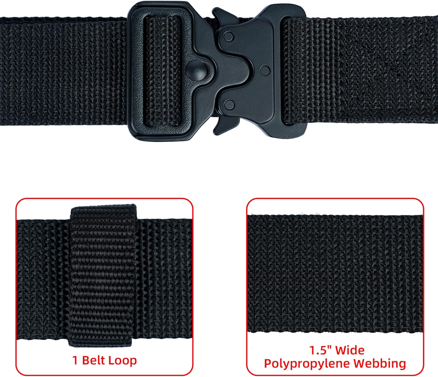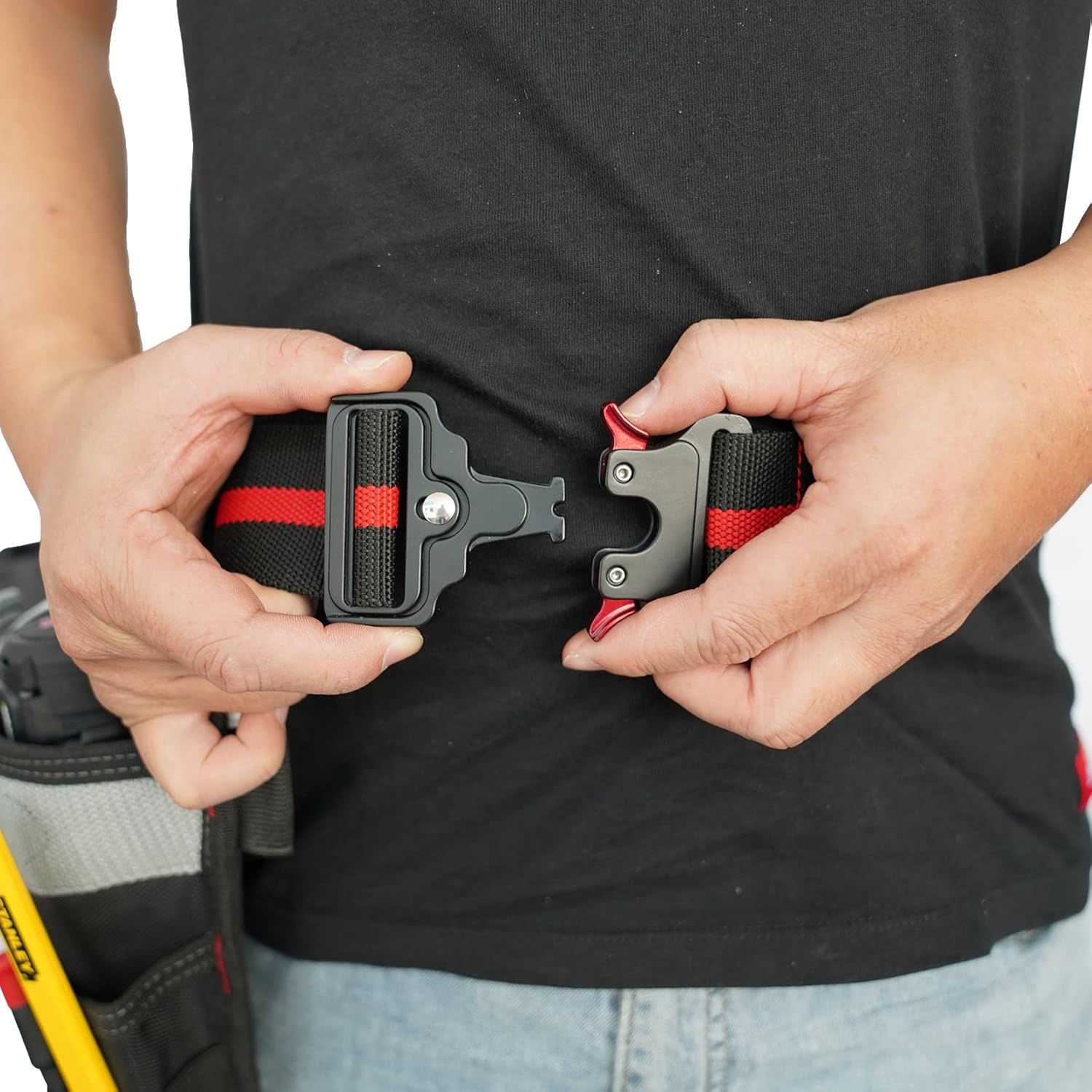 Quick Release Belt Buckle:Intuitive and smooth quick release function when you press down the golden tabs simultaneously. If only one tab is engaged, the connection still holds and locks completely by itself. Once tightened, the belt does not slip, stays in place, comfortable and is easy to close and open. -