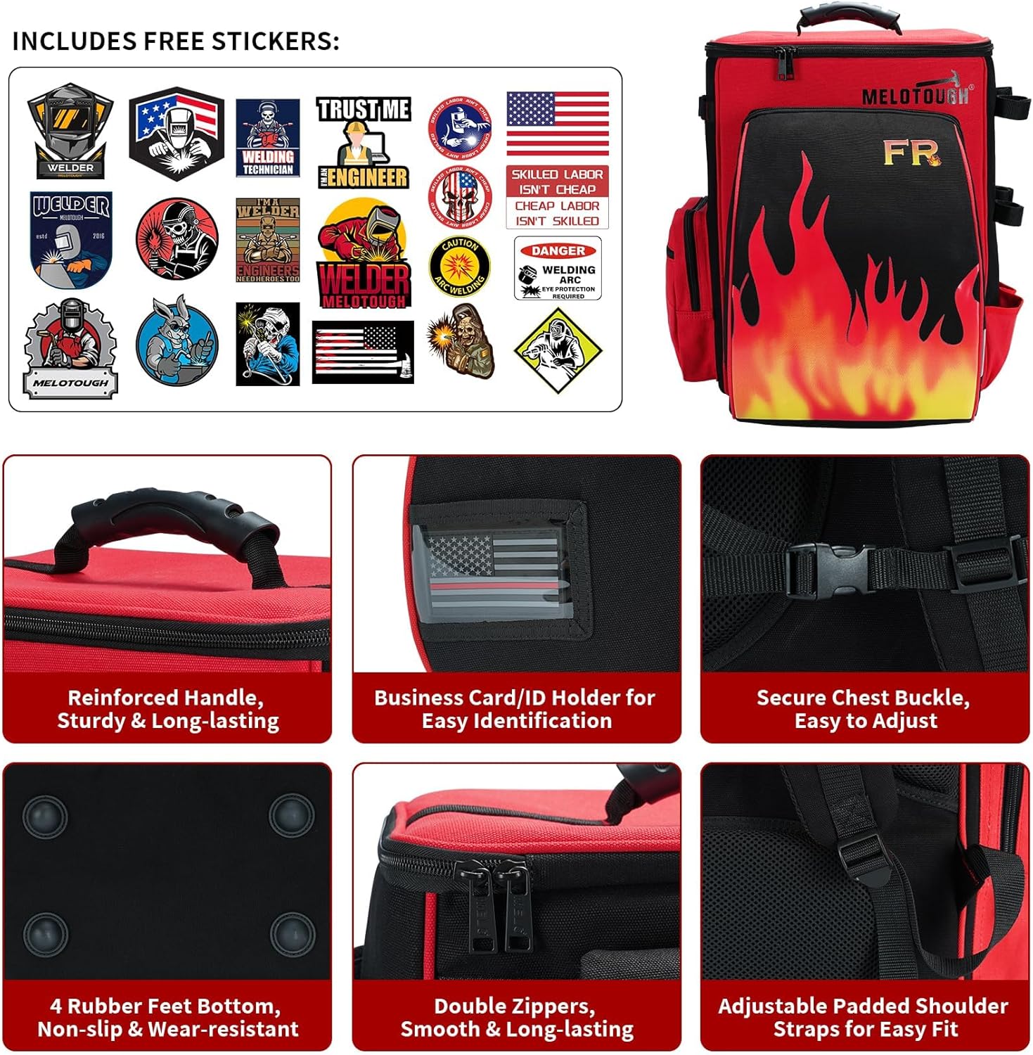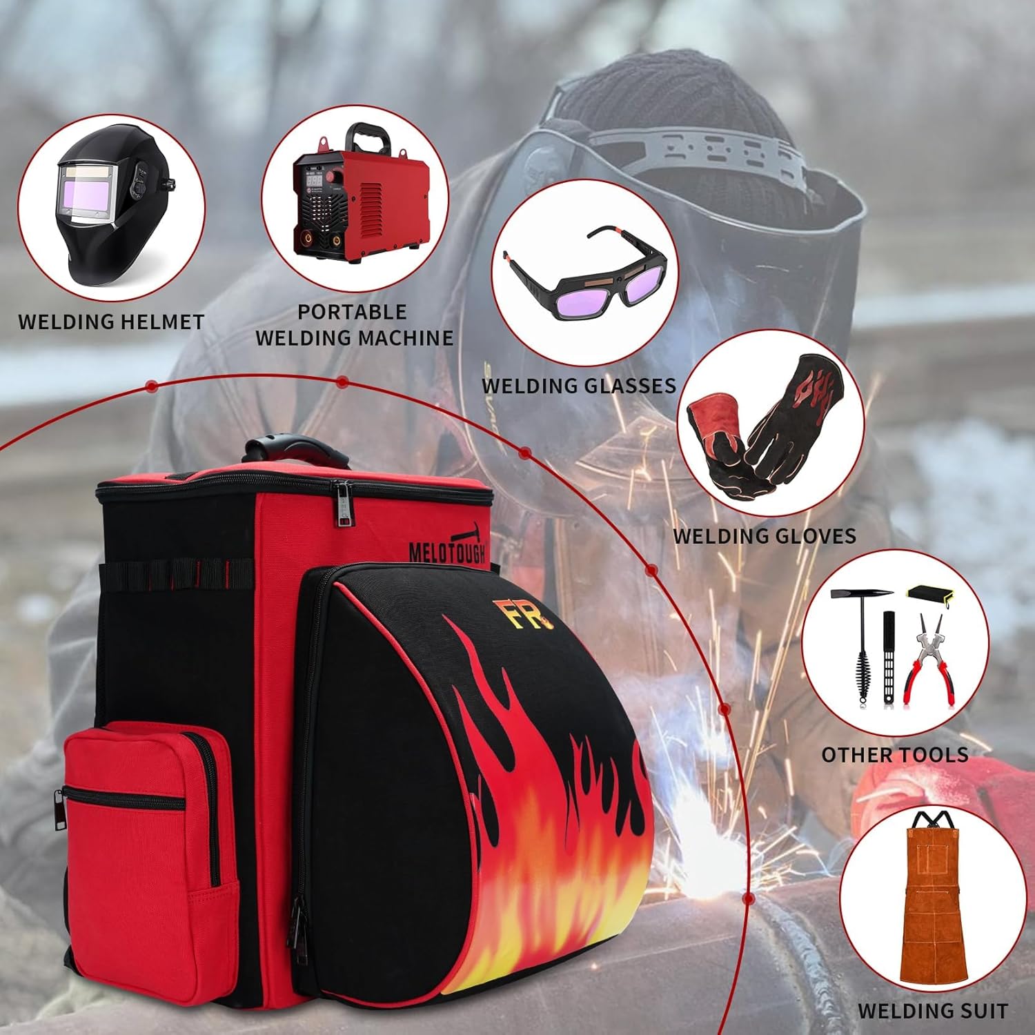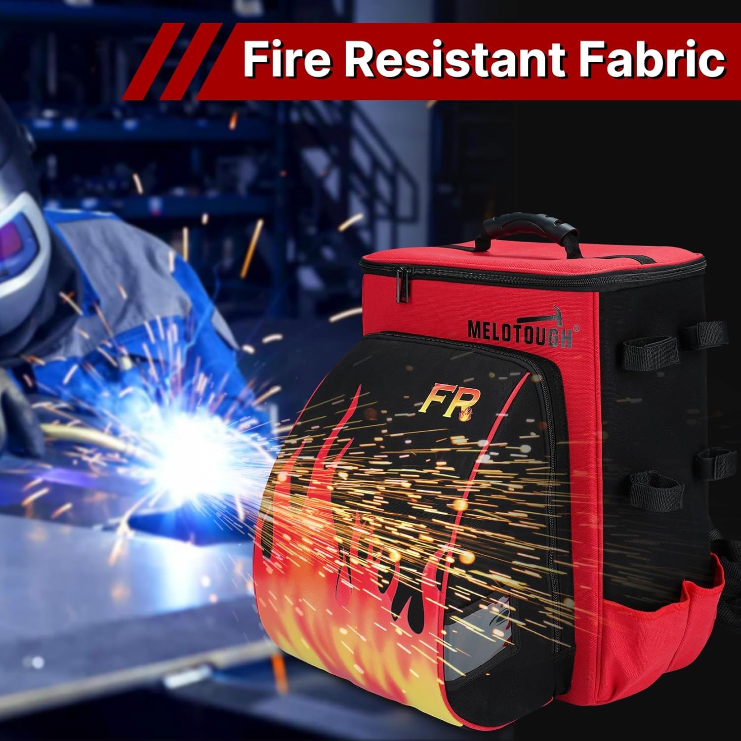 【WT03-Red】MELOTOUGH Welding Backpack Fire - Resistant Fabric 32.56L Large Capacity Welding Bag for Tools and Helmet Multipurpose Welder Backpack with Multiple Storage and Extra Stickers (Red)